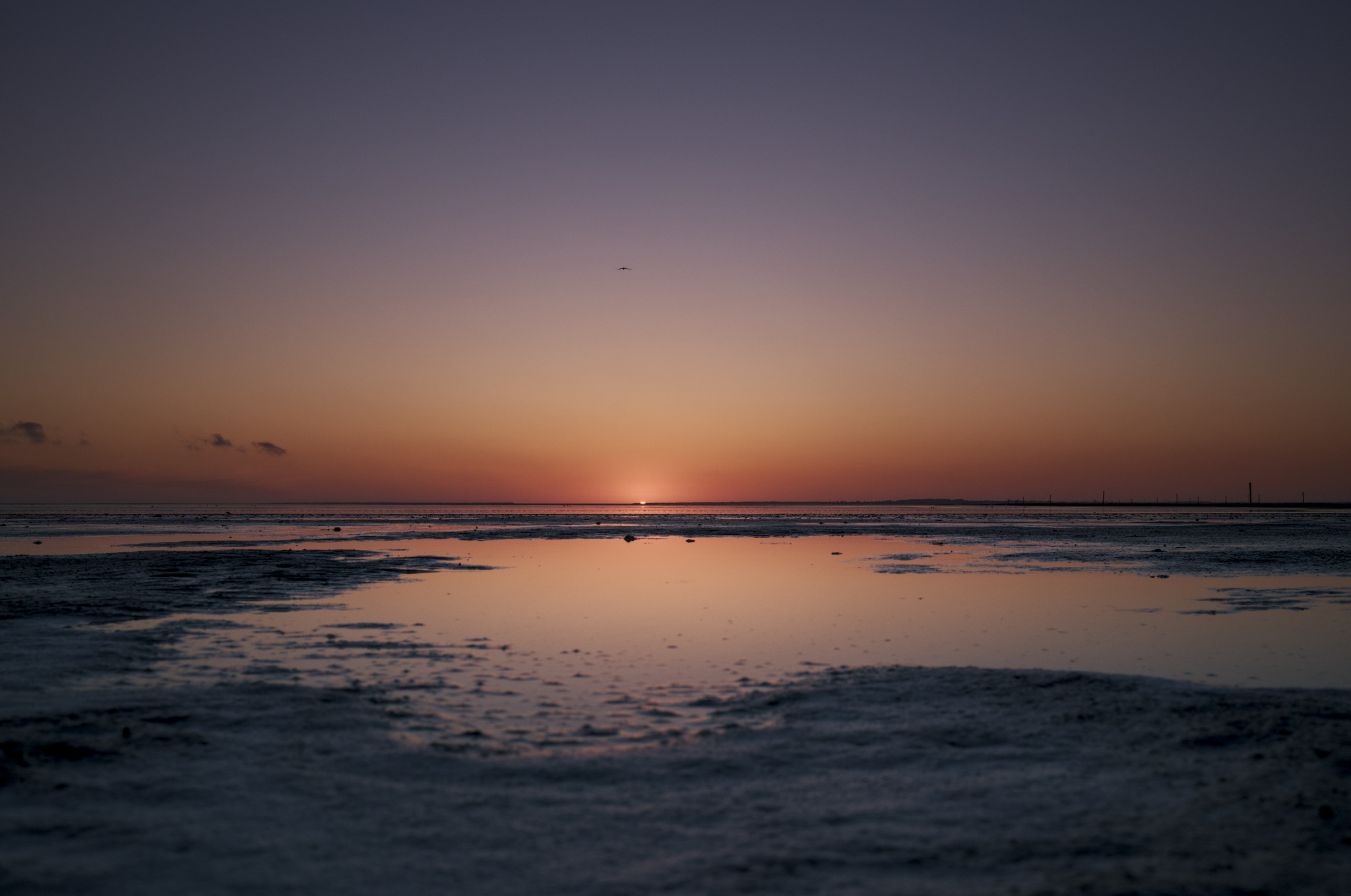 Ein Vogel fliegt in den Sonnenuntergang über dem Wattenmeer der Nordsee. Manchmal wünscht man sich genau diese Freiheit auch.